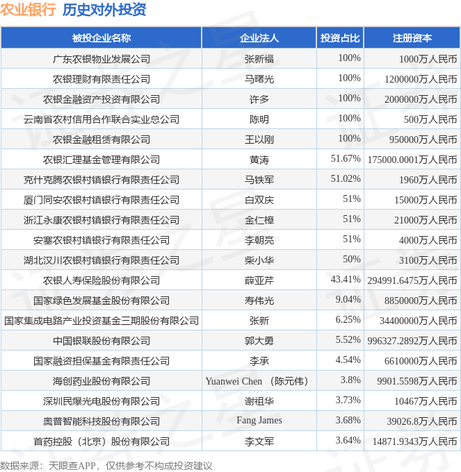 本站消息,根据天眼查APP显示,农业银行(601288.SH)新增一起对外投资事件,被投资公司为安井食品集团股份有限公司,法定代表人刘鸣鸣,投资占比为1.04%。该公司从事食品制造业,注册资本为29329.4232万人民币。目前,农业银行共存在对外投资655项,投资占比前20的项目见下表: